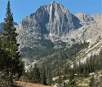 The Citadel is an 11,738-foot-elevation (3,578-meter) mountain summit located in the Sierra Nevada mountain range, in Fresno County of central California, United States.[3] It is situated in northern Kings Canyon National Park, 20 miles (32 km) west-southwest of the community of Big Pine, and 2.4 miles (3.9 km) south of Langille Peak. Topographic relief is significant as it rises 3,400 feet (1,000 meters) above Le Conte Canyon in approximately one mile. The long approach to this remote peak is made via the John Muir Trail. The Northeast Arête, also known as Edge of Time Arête, is considered one of the classic climbing routes in the Sierra Nevada.[5]