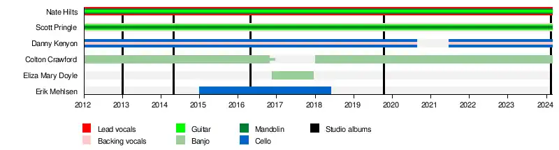 The Dead South is a folk-bluegrass musical ensemble based in Regina, Saskatchewan, Canada. The band was initially formed in 2012 as a quartet by Nate Hilts (vocals, guitar, mandolin), Scott Pringle (guitar, mandolin, vocals), Danny Kenyon (cello, bass, vocals) and Colton Crawford (banjo). Crawford left the band in 2015 and was replaced by studio musician Eliza Mary Doyle before rejoining in 2018.