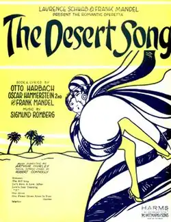 The Desert Song is an operetta with music by Sigmund Romberg and book and lyrics by Oscar Hammerstein II, Otto Harbach and Frank Mandel. It was inspired by the 1925 uprising of the Riffs, a group of Berber fighters, against French colonial rule in Morocco.[1] It was also inspired by stories of Lawrence of Arabia aiding native guerrillas. Many tales romanticizing Saharan North Africa were in vogue, including Beau Geste and The Son of the Sheik.[2]