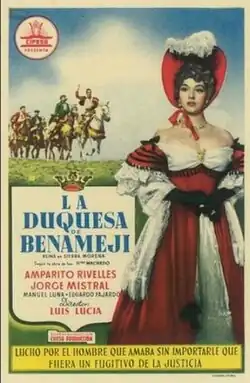 The Duchess of Benameji (Spanish: La duquesa de Benamejí) is a 1949 Spanish historical drama film directed by Luis Lucia and starring Amparo Rivelles. The film is set in the nineteenth century, with Rivelles playing dual roles as a countess and a gypsy. The film was an expensive costume production by Spain's largest studio CIFESA. It is an adaptation of the 1932 play of the same name by Antonio and Manuel Machado. Before its release, the censor demanded that it be rewritten to more overtly punish bandits.[1]