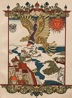 The Prince flies on the wings of the fabulous wooden eagle over the wintry kingdoms. Illustration by Heorhiy Narbut (1909).
