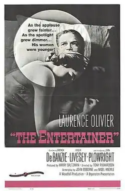 The Entertainer is a 1960 British kitchen sink drama film directed by Tony Richardson, produced by Harry Saltzman and adapted by John Osborne and Nigel Kneale from Osborne's stage play of the same name.[7] The film stars Laurence Olivier as Archie Rice, a failing third-rate music-hall stage performer who tries to keep his career going even as the music-hall tradition fades into history and his personal life falls apart.[8] Olivier was nominated for an Oscar for Best Actor in a Leading Role.[9]