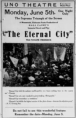 The Eternal City is a 1915 American silent drama film directed by Hugh Ford and Edwin S. Porter, produced by Adolph Zukor. The movie stars Pauline Frederick in her debut film role,[1] The production is based upon the 1901 novel and 1902 Broadway play of the same name by Hall Caine that starred Viola Allen and Frederic De Belleville.[2] Much of The Eternal City was shot on location in England and Italy before being interrupted by the start of the Great War. The film was released through the specially created Select Film Booking Agency for the Famous Players Film Company.