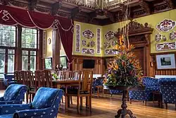 Fernhill Palace was the erstwhile summer residence of the Maharaja of Mysore.[1] The first Fernhills bungalow was built in 1844 as a private residence in the hill station Ooty in the Indian state of Tamil Nadu. In the 1990s, Fernhill Palace became a heritage hotel[2] and today it is considered a luxury resort, attracting visitors from around the world. The palace resembles a Swiss Chalet with its carved wooden bargeboards and ornamental cast iron. The palace grounds with its manicured gardens, firs and cedars accentuate the alpine look of the place. There is a church-like indoor badminton court on the grounds.[1]