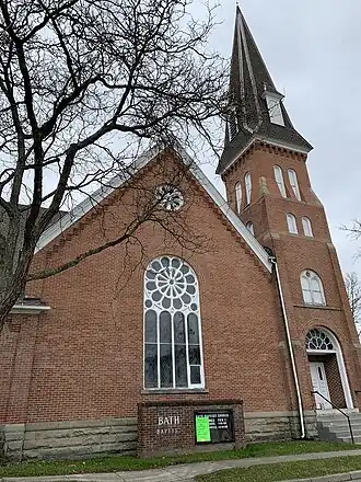 The First Baptist Society of Bath, also known as Bath Baptist Church, is a historic Baptist church located at Bath, Steuben County, New York. The church was built in 1887–1888, and is a cruciform plan, Romanesque Revival style brick and stone church. It has a steep cross-gable roof and square corner bell tower with a tall octagonal spire. The church features rounded windows and lintels. Attached to the church is a fellowship hall built in 1952 and expanded in 1981.[2]: 3
