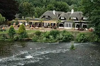 Situated on the River Exe, the inn contains 21 rooms. Although the inn looks very old, it was only built in 1933 as a private fishing lodge for Bickleigh Castle, located nearby in the woods behind the inn. The English Inns website cites the inn as "one of the most picturesque inns in the southwest of England", given its quaint river setting and thatched roof.[2][3] The most scenic rooms with river views are said to be Rooms 10 and 11.[4] In 2008, the rooms were reported to cost £69.95 per night.[3] The Fisherman's Cot also has a function room which is often used for meetings, evening events and wedding receptions.