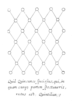 Frontispiece to The Garden of Cyrus (1658). The Latin text, from Quintilian's Institutio Oratoria, translates: "What is more beautiful than the quincunx, that, from whatever direction you regard it, presents straight lines?"[1]