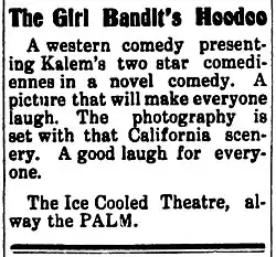 3. ^ "Kalem's Releases And Casts of Characters"/"The Girl Bandits' Hoodoo", Kalem Kalendar, June 15, 1912, p. 3. Both of the given references were retrieved via Internet Archive, May 7, 2023.
