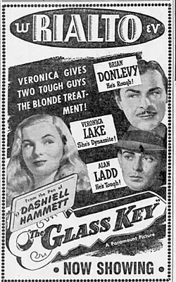The Glass Key is a 1942 American film noir based on the 1931 novel of the same name by Dashiell Hammett. The picture was directed by Stuart Heisler starring Brian Donlevy, Veronica Lake and Alan Ladd (who plays the actual lead despite being billed third). A successful earlier film version starring George Raft in Ladd's role had been released in 1935.[2] The 1942 version's supporting cast features William Bendix, Bonita Granville, Richard Denning and Joseph Calleia.