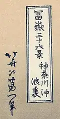 The Great Wave off Kanagawa has two inscriptions. The title of the series is written in the upper-left corner within a rectangular frame, which reads: "冨嶽三十六景/神奈川沖/浪裏" Fugaku Sanjūrokkei / Kanagawa oki / nami ura, meaning "Thirty-six views of Mount Fuji / On the high seas in Kanagawa / Under the wave". The inscription to the left of the box bears the artist's signature: 北斎改爲一筆 Hokusai aratame Iitsu hitsu which reads as "(painting) from the brush of Hokusai, who changed his name to Iitsu".[32] Due to his humble origins, Hokusai had no surname; his first nickname Katsushika was derived from the region he came from. Throughout his career, Hokusai used over 30 names and never started a new cycle of work without changing his name, sometimes leaving his name to his students.[33]