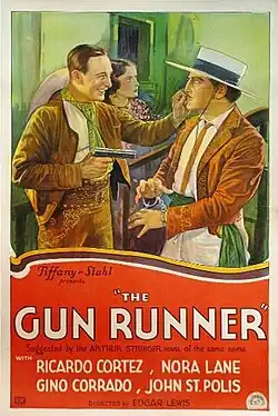 The Gun Runner is a 1928 American silent adventure film directed by Edgar Lewis and starring Ricardo Cortez, Nora Lane and Gino Corrado.[1] The film was based on the 1909 novel of the same title by Arthur Stringer. It was made and released by Tiffany Pictures during John M. Stahl's period as head of production for the studio.