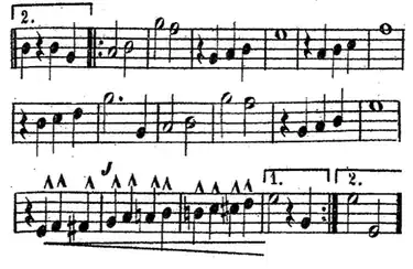 - ^ The other common march form is the military march, which does not use a fourth (D) strain, but recapitulates the trio (C) once or twice, separating the repeats with what is known as a breakstrain: I-AA-BB-C-Br-C-Br-C.