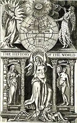 The History of the World (originally The Historie of the VVorld / In Five Bookes) is an incomplete work of history by Sir Walter Raleigh, begun in about 1607 whilst the author was imprisoned in the Tower of London, and first published in 1614. It covers the course of human history from Genesis to the conquest of Macedon by Rome.[1] Raleigh intended to write more volumes relating the rise and fall of the great empires, but his release in 1615, his expedition to Guiana, and his execution in 1618, prevented the accomplishment of his plan.[2] According to Edmund Gosse, "This huge composition is one of the principal glories of seventeenth-century literature, and takes a very prominent place in the history of English prose."[3]