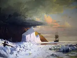 The Icebergs is an 1861 oil painting by the American landscape artist Frederic Edwin Church. It was inspired by his 1859 voyage to the North Atlantic around Newfoundland and Labrador. Considered one of Church's "Great Pictures"—measuring 1.64 by 2.85 metres (5.4 by 9.4 feet)[1]—the painting depicts one or more icebergs in the afternoon light of the Arctic. It was first displayed in New York City in 1861, where visitors paid 25 cents' admittance to the one-painting show. Similar exhibitions in Boston and London followed. The unconventional landscape of ice, water, and sky generally drew praise, but the American Civil War, which began the same year, lessened critical and popular interest in New York City's cultural events.