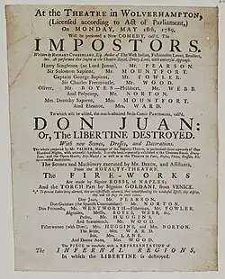 The Impostors is a comedy play by Richard Cumberland. It was first performed at the Drury Lane Theatre in January 1789.[2] The plot closely resembled that of The Beaux' Stratagem by George Farquhar.