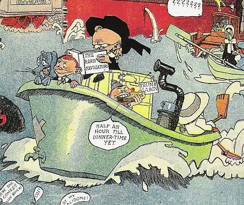 The Kin-der-Kids featured an ongoing story about the three Kin-der brothers who, along with their dog and a mechanical boy, sailed in the family's antique bathtub to explore the world. The story implies that the Kin-ders sailed for a specific reason: early on they receive a note – unseen to the reader – from Mysterious Pete which contains instructions for their journey. These instructions and the purpose of their journey remain indeterminate for the life of the comic.