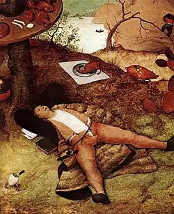 Het Luilekkerland (Dutch, "Cockaigne", literally "The Lazy-Tasty Land"[1]) – known in English as The Land of Cockaigne – is a 1567 oil painting by the Netherlandish Renaissance artist Pieter Bruegel the Elder (c. 1525–1569). In medieval times, Cockaigne was a mythical land of plenty, but Bruegel's depiction of Cockaigne and its residents is not meant to be a flattering one. He chooses rather a comic illustration of the spiritual emptiness believed to derive from gluttony and sloth, two of the seven deadly sins.[2]