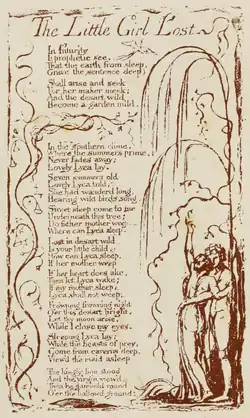 "The Little Girl Lost" is a 1794 poem published by William Blake in his collection Songs of Innocence and of Experience. According to scholar, Grevel Lindop, this poem represents Blake's pattern of the transition between "the spontaneous, imaginative Innocence of childhood" to the "complex and mature (but also more dangerous) adult state of Experience."[1]