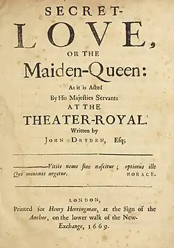 Secret Love, or The Maiden Queen is a 1667 tragicomedy written by John Dryden. The play, commonly known by its subtitle, was acted by the King's Company at the Theatre Royal, Drury Lane (which had escaped the Great Fire of London the year before). The premiere occurred on 2 March, and was a popular success. King Charles II,[1] his brother the Duke of York and future King James II, and Samuel Pepys were all in the audience on opening night.[2] The play was first published in 1668 by the London bookseller Henry Herringman.[3]