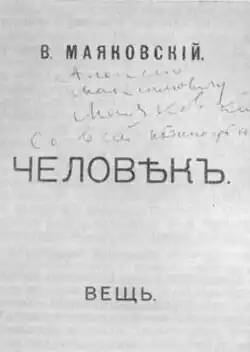 The Man (Человек, Tchelovek) is a poem by Vladimir Mayakovsky written in late-1916 - early-1917 and published in February 1918 by the ASIS Publishers, subtitled "The Thing" (Вещь).[1]