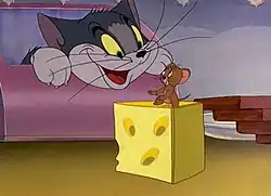 Jerry "salutes" the cat and returns the slice of cheese to the refrigerator. He then proceeds to steal just a tiny bit of cheese, but Tom stomps on his tail with one of his hind paws and replaces the cheese. However, the cat soon realizes that he has the free run of the refrigerator, so he places an iron on top of Jerry's tail and begins eating. Jerry frees himself, but is soon caught by Tom and returns himself to the iron.