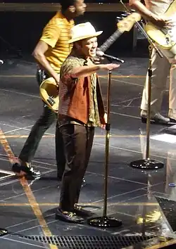 He then performed a "90s R&B homage" along with "demure sexual come-ons" by covering Soul For Real's "Candy Rain" and Ginuwine's "Pony." The latter was blended into Mars's "Our First Time."[22][24] In the latter's medleys, Mars would sing R. Kelly's "Ignition (Remix)" and Sister Nancy's "Bam Bam."[22][19] These covers would vary between concerts and could also include Ghost Town DJs' "My Boo," Aaliyah's "Rock the Boat," "Every Little Step" by Bobby Brown, Mad Cobra's "Flex," and Lloyd's "Secret Admirer."[16][18][26] "Marry You," the next track on the setlist, showed "pleading doo-wop accents."[27] In some venues it was preceded by The Desires' "Let It Please Be You."[28] It was followed by "If I Knew," during which Mars chose a woman from the audience so that he and The Hooligans could serenade her to see who could impress the girl more.[20][29] The recording could be interpolated with "It Will Rain" or "Nothin' on You."[25][27] The latter could also be played solely.[25] "If I Knew" plunged low and slow at the end, before bursting into the "50s-era rock" dance track "Runaway Baby" as the fans "erupted" when the singer channeled The Isley Brothers' "little-bit-softer-now/little-bit-louder-now" routine.[22][23][24]