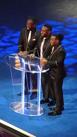 ![]() The New Day's Kofi Kingston (left) and Xavier Woods at a WWE Live tour event in 2016 | |