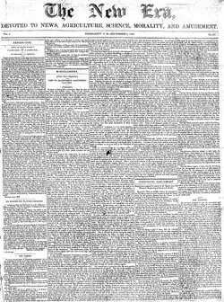 The New Era began as a four-page weekly on February 5, 1852, under George S. Porter, born in 1813 and originally from Norwich, England.[2] He controlled the paper for a year before heading to Australia where he lived into his 100th year.[3][4] During his tenure the paper reprinted long tracts on topics of the day, but struggled to find a readership among the 500 members of the pre-incorporation village of Newmarket. This was attributed to a lack of money and the education potential of readers.[5] He sold the paper to new arrivals from Toronto, Erastus Jackson and A. E. R. Henderson.[6]