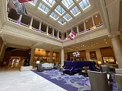 In 1921, an 18-storey tower, costing CA$2,500,000 (equivalent to $39,275,000 in 2023),[7] designed by Chicago architect Henry Ives Cobb, with 530 additional rooms was added to the east of the original eight-storey structure, replacing the Sullivan Hotel on the site. On the two top floors of the tower is the Crystal Ballroom, that until the late 1950s was the most fashionable in the city. The room was closed in the late 1950s due to stricter fire codes and was not restored during the 1979-81 renovation.[8] When the Omni Hotel chain invested in the hotel in 2013, restoring the ballroom was one of its announced goals.[9] The ballroom re-opened in April 2017 after a closure of 38 years.[10]