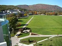 The Plain at West Point as viewed from the balcony of Jefferson Library, with Eisenhower statue and Diagonal Walk in foreground.