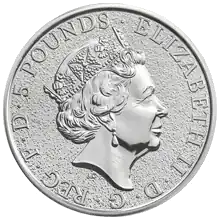 The Queen's Beasts coins are British coins issued by the Royal Mint in platinum, gold, and silver since 2016.[1][2][3][4][5][6][7] Each of the 10 beast coins in the series features a stylized version of one of the heraldic Queen's Beasts statues present at the coronation of Queen Elizabeth II representing her royal line of ancestry. The silver coin is notable as the first two-ounce United Kingdom silver bullion coin.[1] Engraver Jody Clark designed the entire series.[1] In December 2016, a full line of proof-quality coins was announced.[8] In 2017, the mint began producing a platinum version of the coin. In April 2021, the Royal Mint issued an eleventh "Completer Coin" that featured all 10 of the Queen's Beasts, taking the series to 11 coins in total. The April 2021 release included a "one of a kind" gold coin weighing 10 kg and a denominated value of £10,000. Based upon the UK spot price at the time of release, the 10 kg gold coin had an intrinsic scrap value of approximately £411,000. It was widely reported that the 10 kg gold coin was the heaviest gold coin the Royal Mint had ever produced and that it had taken 400 hours to produce, four days to polish and has been described as a "Masterwork". The Royal Mint announced that Completer Coin completes the Queen's Beasts commemorative collection.[9]