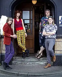 Landlords Dave and Fiona Dulake, with RJ Learmouth and James Vessey-Miller (2019)