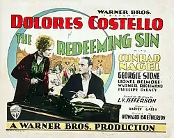 The Redeeming Sin is a 1929 American sound part-talkie crime drama film directed by Howard Bretherton. In addition to sequences with audible dialogue or talking sequences, the film features a synchronized musical score and sound effects along with English intertitles. According to the film review in Variety, 32 minutes of the total running time featured dialogue.[1] The soundtrack was recorded using the Vitaphone sound-on-disc system. It was produced and distributed by Warner Bros. and stars Dolores Costello. The Redeeming Sin is a lost film.[2][3][4][5]