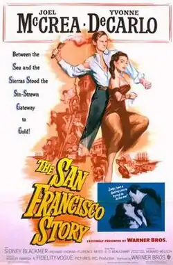 The San Francisco Story is a 1952 American Western film directed by Robert Parrish and starring Joel McCrea and Yvonne De Carlo.[1] The rough and tumble Barbary Coast of San Francisco is recreated with attention to detail, including Florence Bates as a saloon keeper Shanghaiing the unwary. Noir elements include many shadows, a discordant musical score, snappy dialogue, a disabused hero who resists the good fight, and a femme fatale. A schematic but insightful rendering of political corruption, the film is essentially about standing up to bullies.
