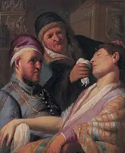 Stone Operation shows a man being operated on by a barber-surgeon watched by the latter's assistant.[2] This work is again in the Leiden Collection.[2] "Stone removal" operations were offered to patients as supposed cure for headaches.[2] Rembrandt is alluding to the Dutch idiom "cutting out a stone", meaning to fool someone.[2] It is possible that the model for the barber-surgeon was Rembrandt's father.[2]