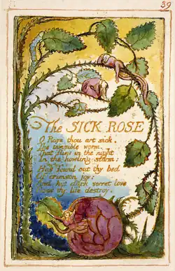 "The Sick Rose" is a poem by William Blake, originally published in Songs of Innocence and of Experience as the 39th plate; the incipit of the poem is O Rose thou art sick. Blake composed the poem sometime after 1789, and presented it with an illuminated border and illustration, typical of his self-publications.[1] Since the 20th century, the poem has been the subject of scrutiny by scholars for its oblique and enigmatic meaning, and bizarre, suggestive imagery.[2]