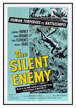 The Silent Enemy is a black and white 1958 British action film, directed by William Fairchild and starring Laurence Harvey, Dawn Addams, Michael Craig and John Clements.[1] Based on Marshall Pugh's 1956 book Commander Crabb, the film follows the publicity created by Lionel Crabb's mysterious disappearance and likely death during a Cold War incident 2 years earlier (April 1956).The film depicts events in Gibraltar harbour during the World War II Italian frogman and manned torpedo attacks, although the film's depiction of the events is highly fictionalised. It was the first Universal Pictures film in SuperScope.