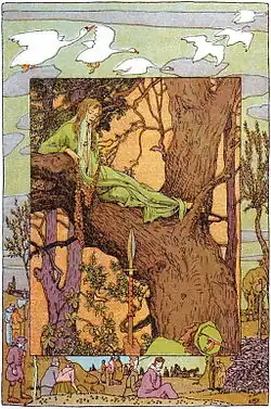 • Irish novelist Padraic Colum used a similar tale in his novel The King of Ireland's Son, in the chapter The Unique Tale: the queen wishes for a blue-eyed, blonde-haired daughter, and carelessly wishes her sons to "go with the wild geese". As soon as the daughter is born, the princes change into gray wild geese and fly away from the castle.[55]