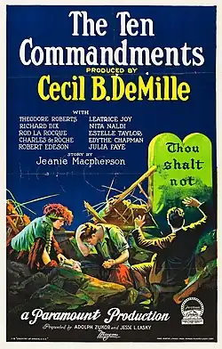 The Ten Commandments is a 1923 American silent religious epic film produced and directed by Cecil B. DeMille. Written by Jeanie MacPherson, the film is divided into two parts: a prologue recreating the biblical story of the Exodus and a modern story concerning two brothers and their respective views of the Ten Commandments.