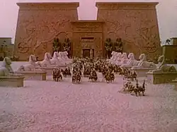 The Exodus scenes were filmed at the Guadalupe-Nipomo Dunes in northern Santa Barbara County.[2] The film location was originally chosen because its immense sand dunes provided a superficial resemblance to the Egyptian desert. Rumor had it that after the filming was complete, the massive sets – which included four 35-foot-tall (11 m) Pharaoh statues, 21 sphinxes, and gates reaching a height of 110 feet, which were built by a small army of 1,600 workers – were dynamited and buried in the sand. Instead, the wind, rain and sand at the Guadalupe-Nipomo Dunes likely collapsed and buried a large part of the set under the ever-shifting dunes. The statues and sphinxes are in roughly the same place they were during filming. In 2012, archaeologists uncovered the head of one of the prop sphinxes; a 2014 recovery effort showed the body of that sphinx to have deteriorated significantly, but a second better-preserved sphinx was discovered and excavated.[6][7] The effort to locate and excavate the set was the subject of a 2016 documentary, The Lost City of Cecil B. DeMille.[8]