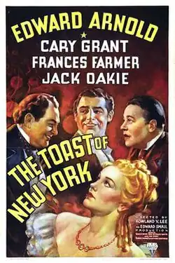 The Toast of New York is a 1937 American biographical film directed by Rowland V. Lee and starring Edward Arnold, Cary Grant, Frances Farmer, and Jack Oakie. The film is a fictionalized account of the lives of financiers James Fisk and Edward S. Stokes.[3] The screenplay was based on the book The Book of Daniel Drew by Bouck White and the story "Robber Barons" by Matthew Josephson.