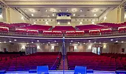 The auditorium has a parterre-level orchestra and a single balcony, with a small stage behind the proscenium arch.[25][26] The auditorium has a seating capacity of 1,495.[27] Every effort was taken to ensure that no seats had obstructed views,[26][28] which led to the Town Hall's long-standing mantra "Not a bad seat in the house".[4] The balcony is cantilevered from the structural framework, which obviated the need for columns that blocked audience views.[22] The balcony has a loge, or theatrical box.[19][26] The front of the balcony contains a wrought-iron balustrade. The auditorium retains most of its original wicker seat designs, except for the loge, where modern theatrical seats have been installed.[29] The original seats were capable of unusually high levels of acoustic absorption; they were replaced in the 1980s by seats with similar acoustic qualities.[30] The writer Harold C. Schonberg wrote that only the seating on the balcony had good acoustics, as the balcony's presence muffled the sounds at orchestra level.[31]
