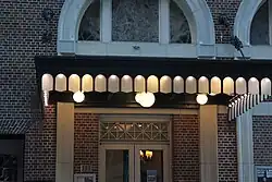 Five of the arched openings have steel-and-glass canopies above them. The canopies are cantilevered from steel rods that extend diagonally from the facade.[20] There are three such canopies: one above each outermost arch and one above the center three doorways.[19] Underneath each canopy are spherical lamps, with glass shades at the edges of the canopy.[19][21] The centers of the canopies' undersides have large spherical lamps, which are surrounded by smaller spheres.[21] A Greek key band course runs above the mezzanine.[19]