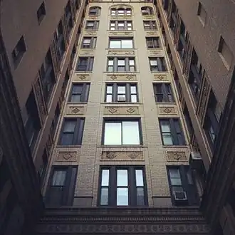 The architect, Albert Joseph Bodker, erected it as 12 stories consisting of 72 units, offering 5 to 9 room residences.[1] The building layout features an “H” design with four connected towers. The main entrance features a deep garden courtyard leading to a step-up lobby.