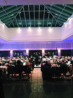 Originally designed by architect Philip Johnson and noted acoustician Cyril M. Harris, the $32 million building opened in 2008 as the home of the now defunct Pennsylvania Academy of Music.[6][4][7] The building became available due to the bankruptcy of the PA Academy of Music at the same time Millersville University was planning an extensive renovation of its main campus arts center.[7] Millersville University began leasing the building in June 2010, shortly after the PA Academy of Music left the building.[8][9][10] The Pennsylvania Department of General Services then bought the building from Union Community Bank on Millersville's behalf for $10.9 million in March 2011.[8][10] $14.5 million was originally allocated by the state of Pennsylvania for purchasing the 63,000-square-foot building on Millersville's behalf, as well as equipping, furnishing and renovating it.[10]