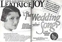 3. ^ "New Pictures: The Wedding Song", Exhibitors Herald, 23 (6), Chicago, Illinois: Exhibitors Herald Company: 57, October 31, 1925, retrieved November 1, 2022 Public Domain This article incorporates text from this source, which is in the public domain.