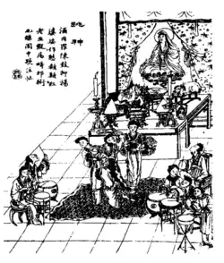 In Jinan, and even more so in Beijing, elderly female shamans are often invited to sick beds to perform a ritual known as tiaoshen (跳神) intended to drive away the illness; they are also asked to bless the newly-weds. Pu Songling continues by going into great detail about these witches' methods.