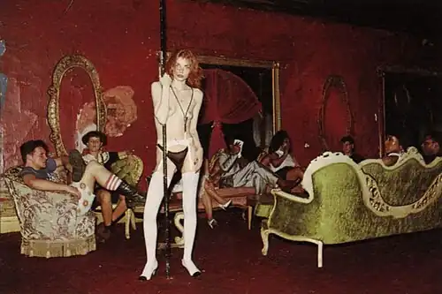 An early incubator of New York's house music and club kid scenes, the World helped launch the careers of several prominent nightlife figures, including Michael Alig, DJ Larry Tee, DJ David Morales, DJ Frankie Knuckles, DJ Kip Lavinger, DJ Zoe B, the Lady Bunny, and Dean Johnson, whose Tuesday night "Rock and Roll Fag Bar" party gave rise to New York's gay rock and roll scene.[3][4] Several big-name music acts also made cameo appearances at The World, including David Bowie, the Beastie Boys, Debbie Harry, The Ramones, Echo & the Bunnymen, Madness, Big Audio Dynamite, Sinéad O'Connor, Public Enemy, Neil Young, The Sugarcubes, Salt-N-Pepa, and Pink Floyd.[5] The World was also used as one of the filming locations for Devo's 1988 music video for the song "Disco Dancer"