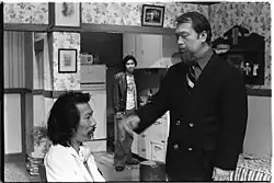 Playwright Frank Chin as "Fred Eng" comforts his mother Hyacinth in a scene from the AATW production in San Francisco 1978