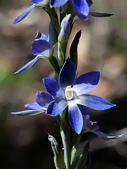 Thelymitra aristata, commonly called the great sun orchid,[2] is a species of orchid that is endemic to south-eastern Australia. It has a single large, thick leaf and bracts and up to forty crowded blue or purplish flowers with darker veins.